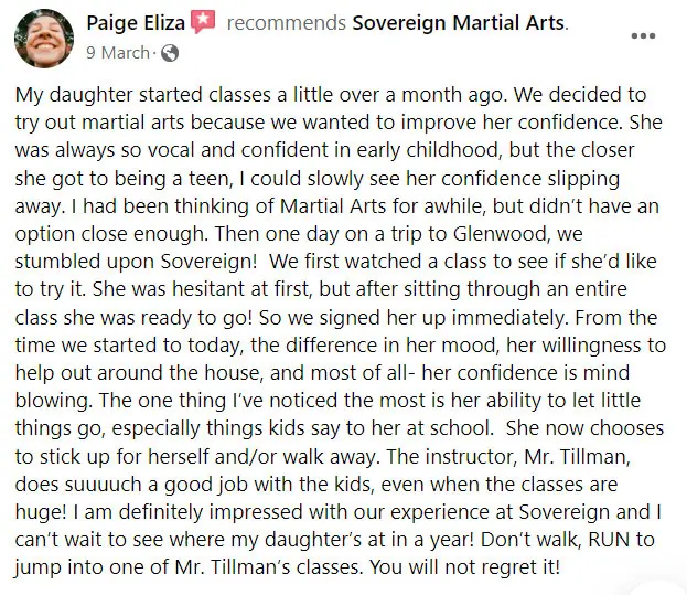 We find that our students become more confident to stand up to bullies and have more humility and kindness to others through their martial arts lessons.